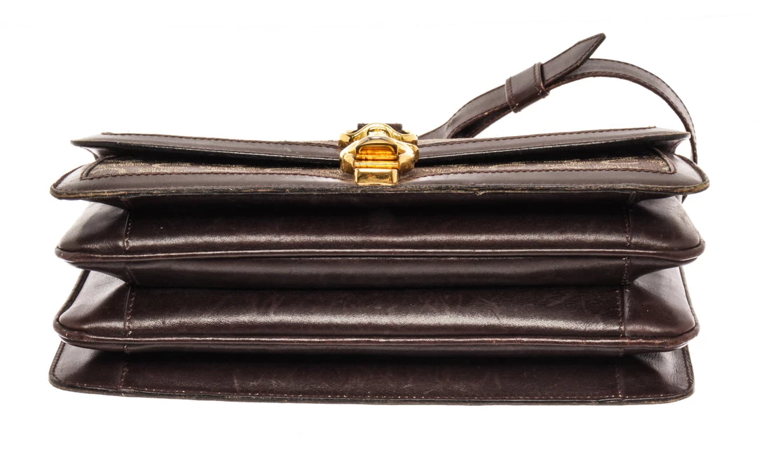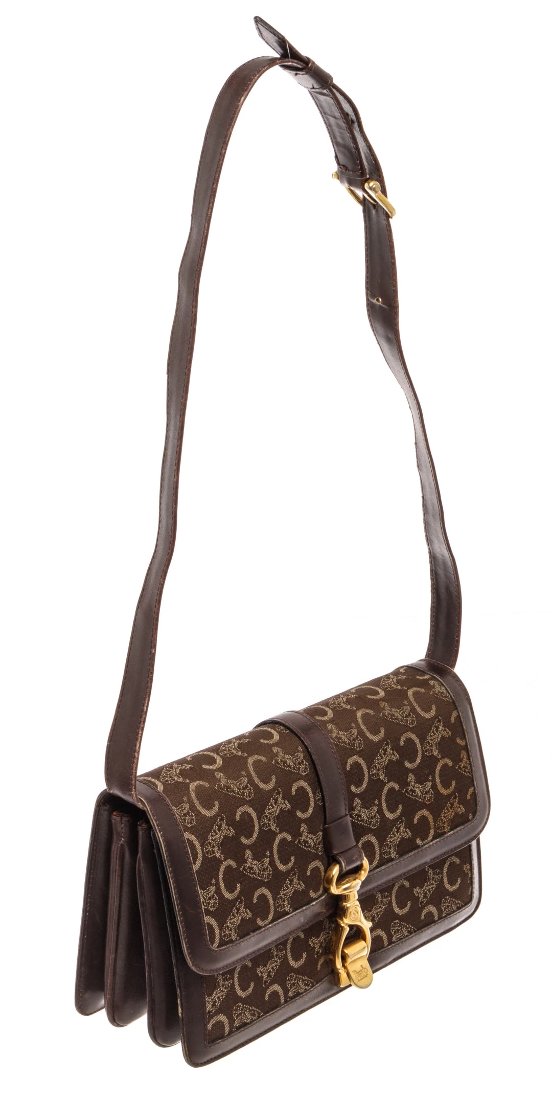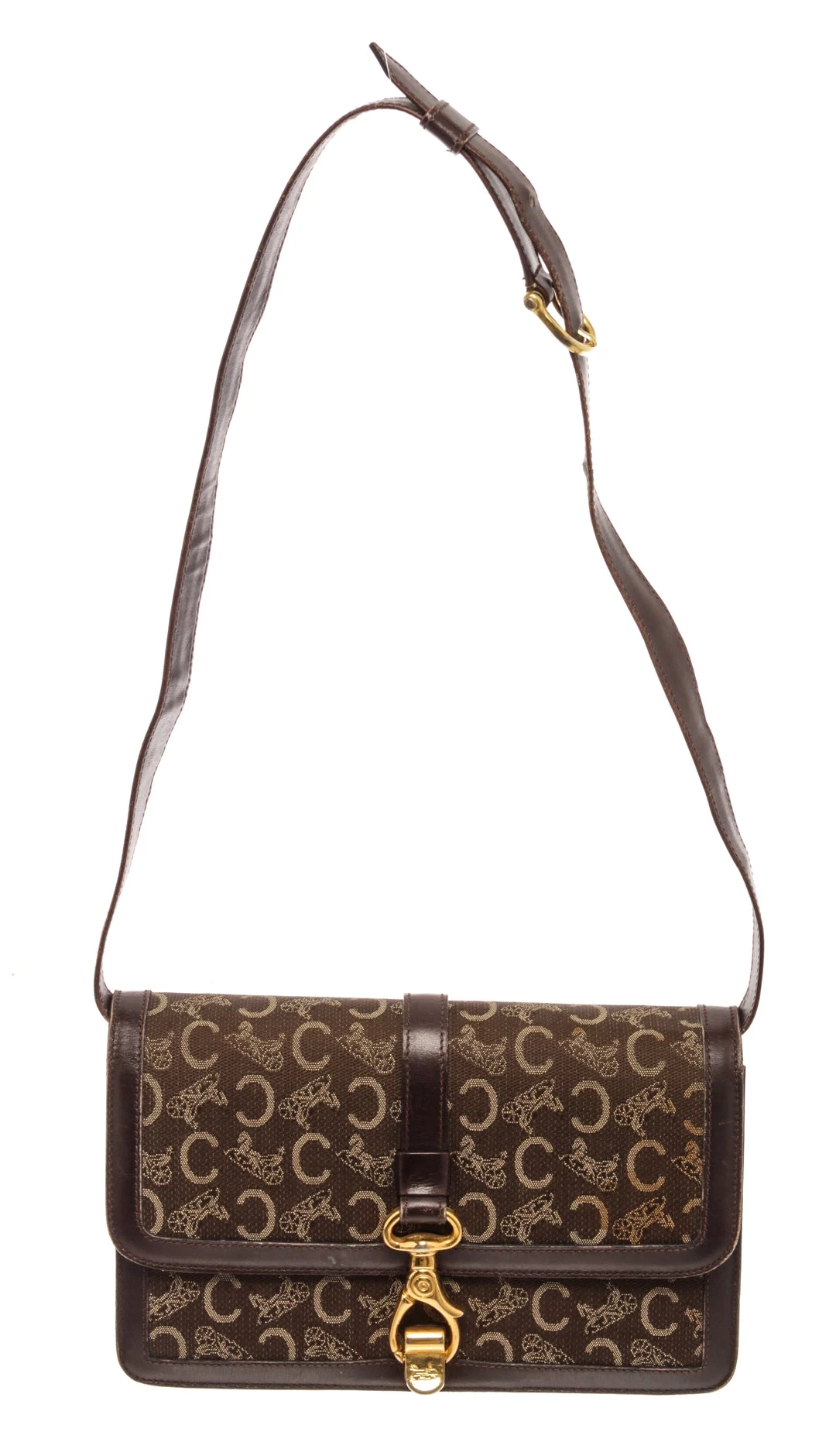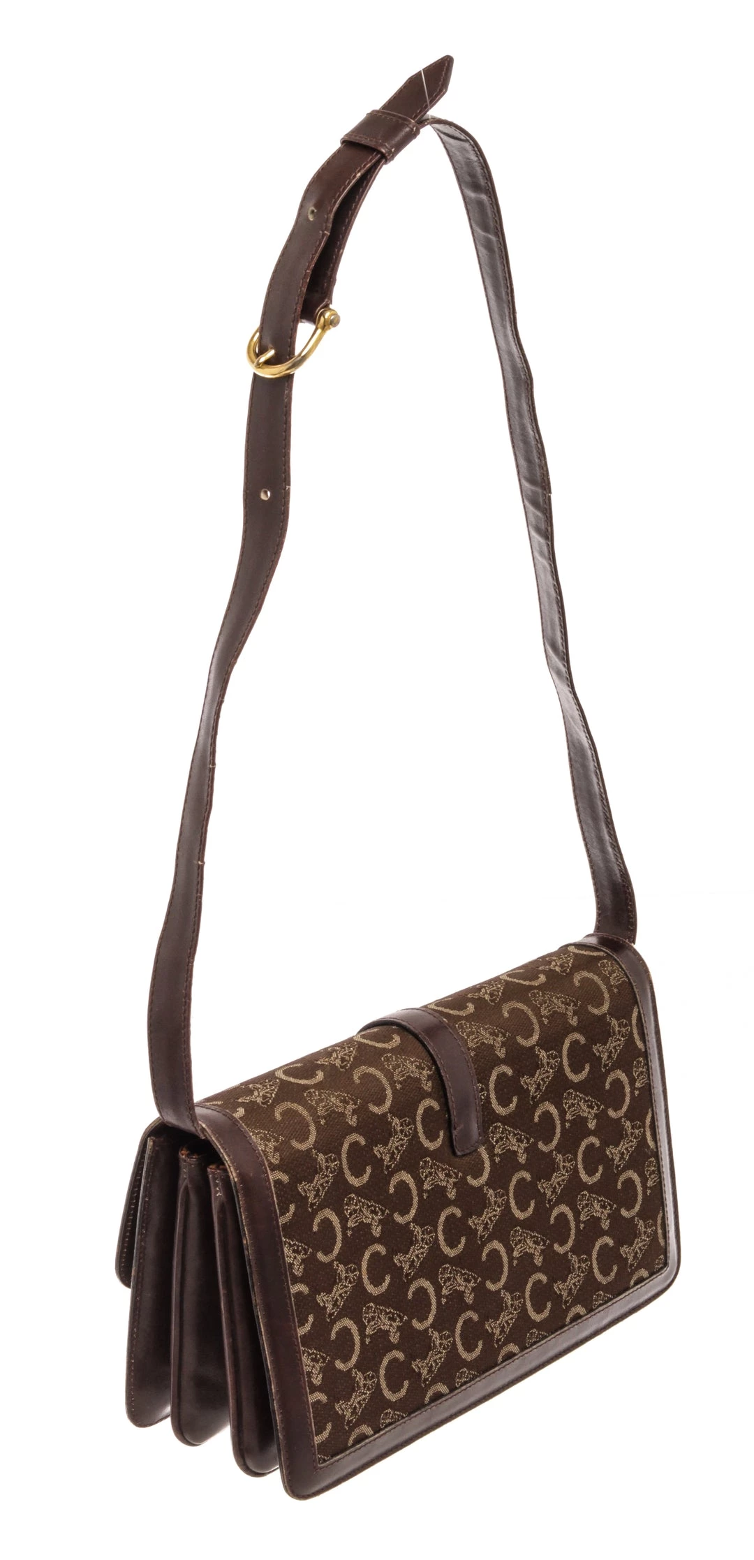 Celine Brown Canvas C Macadam Shoulder Bag with gold-tone hardware, adjustable leather shoulder strap, Flap closure.