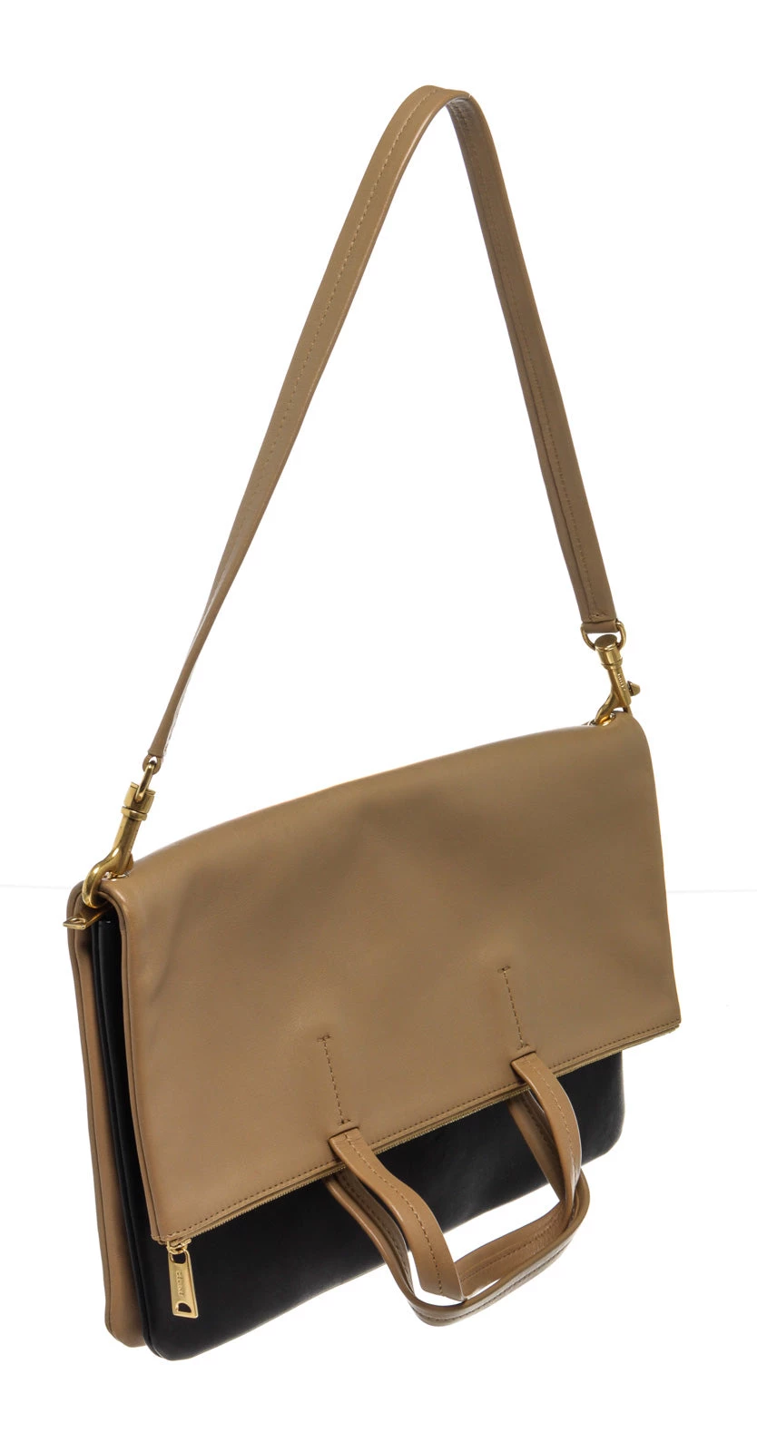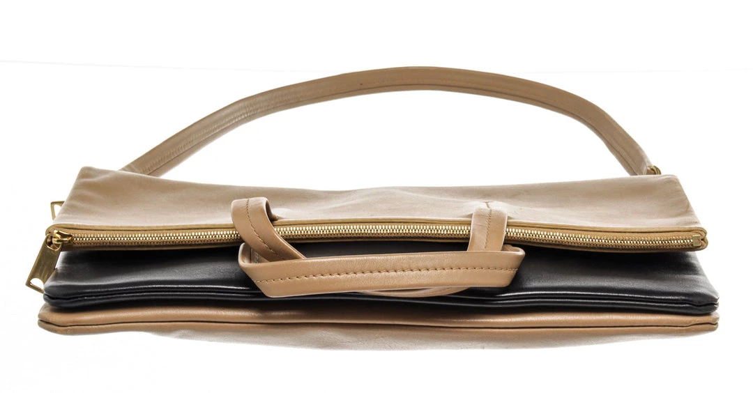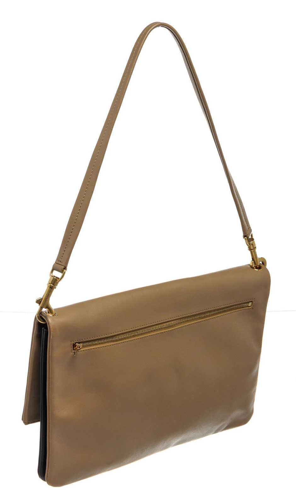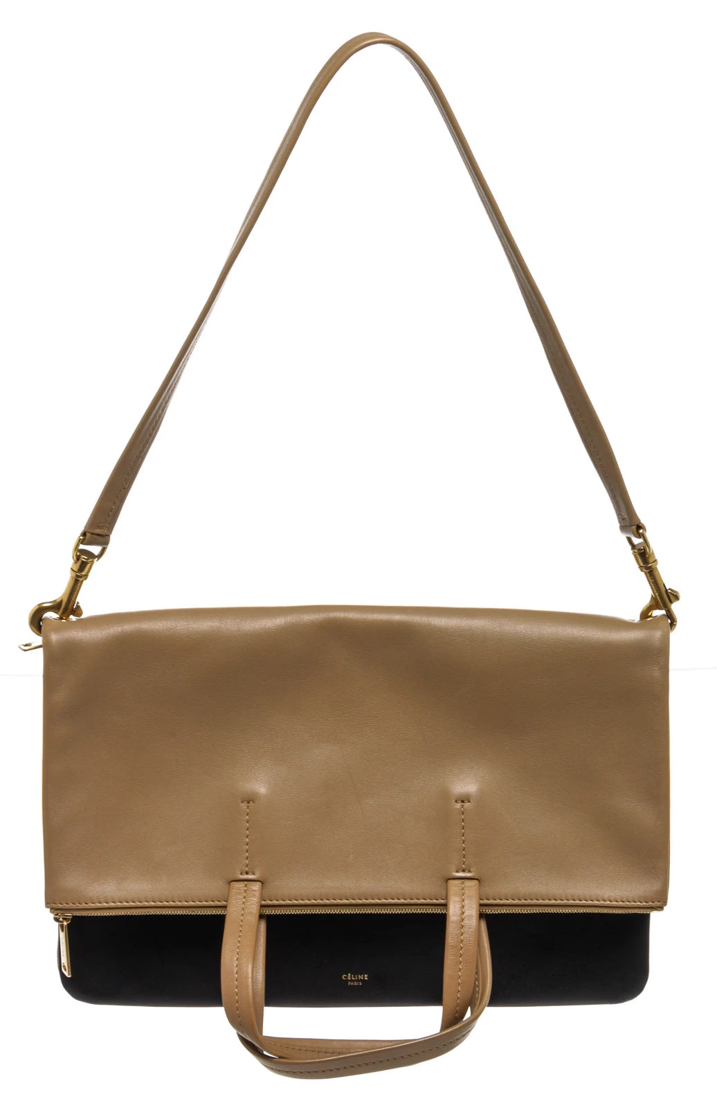 Celine Brown Leather Folded Cabas Shoulder BagΒ with leather, gold-toneΒ hardware, trim leather, exterior zip pocket, interior zip slip pocket,Β shoulder strapΒ andΒ snapΒ closure.