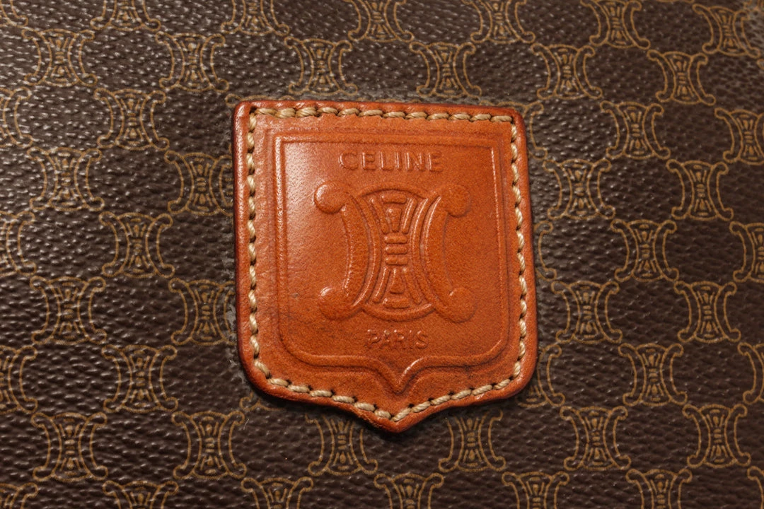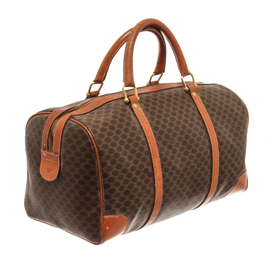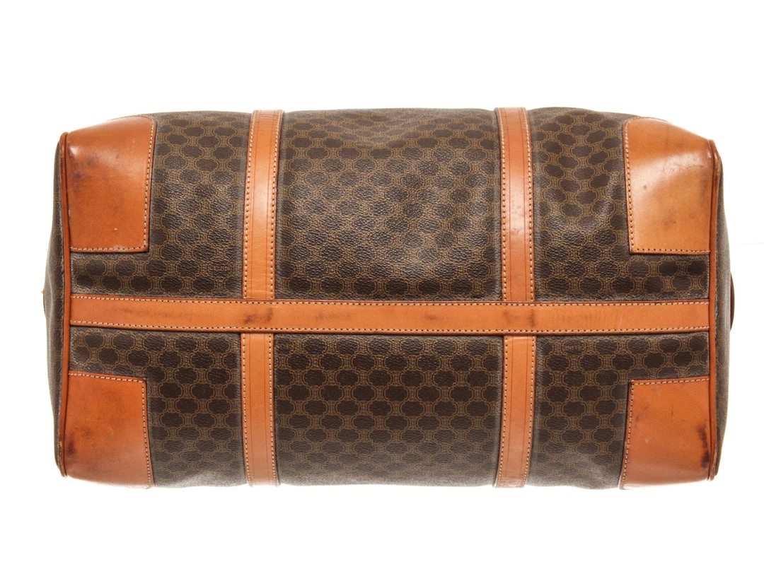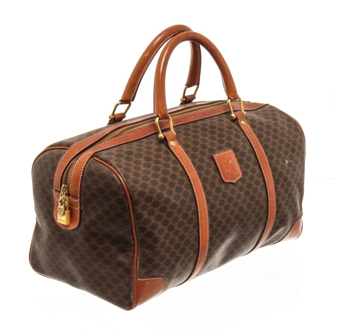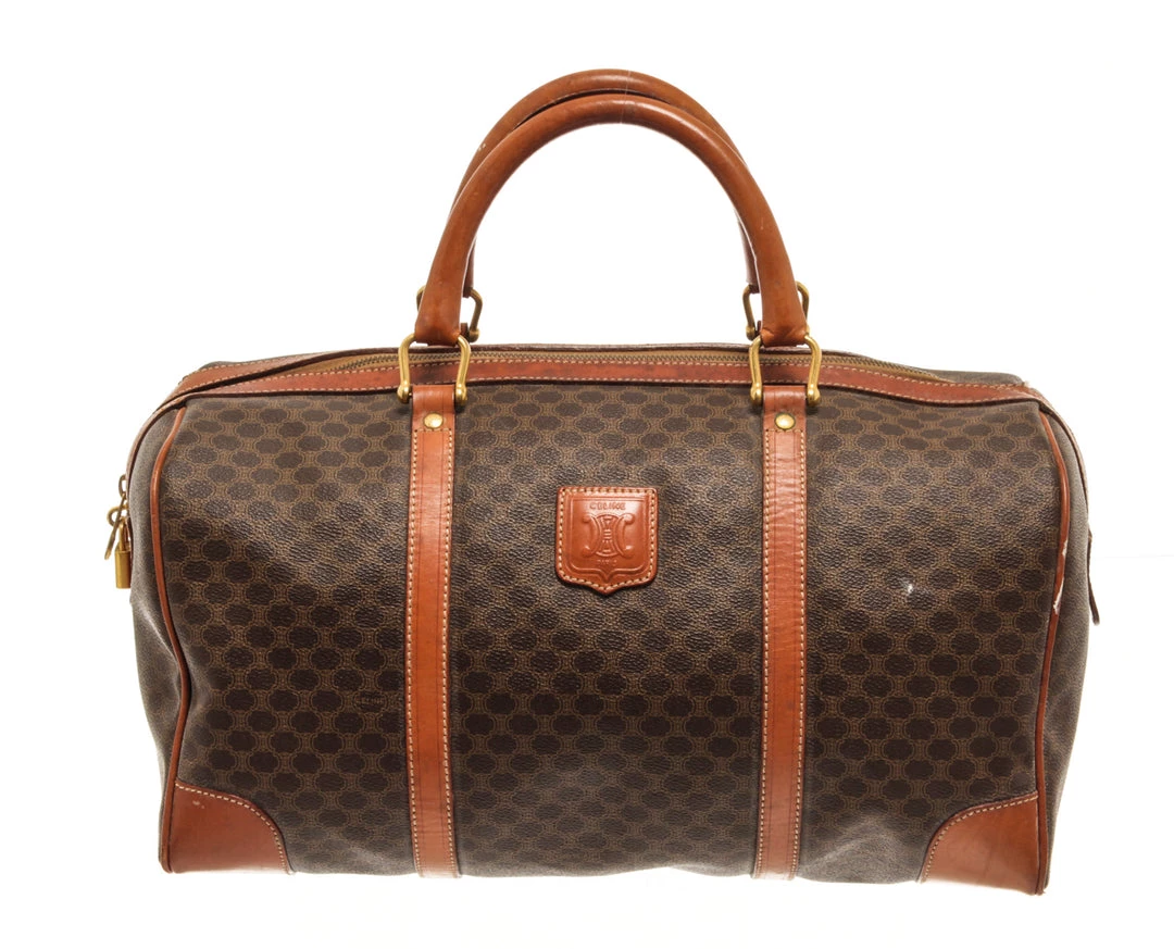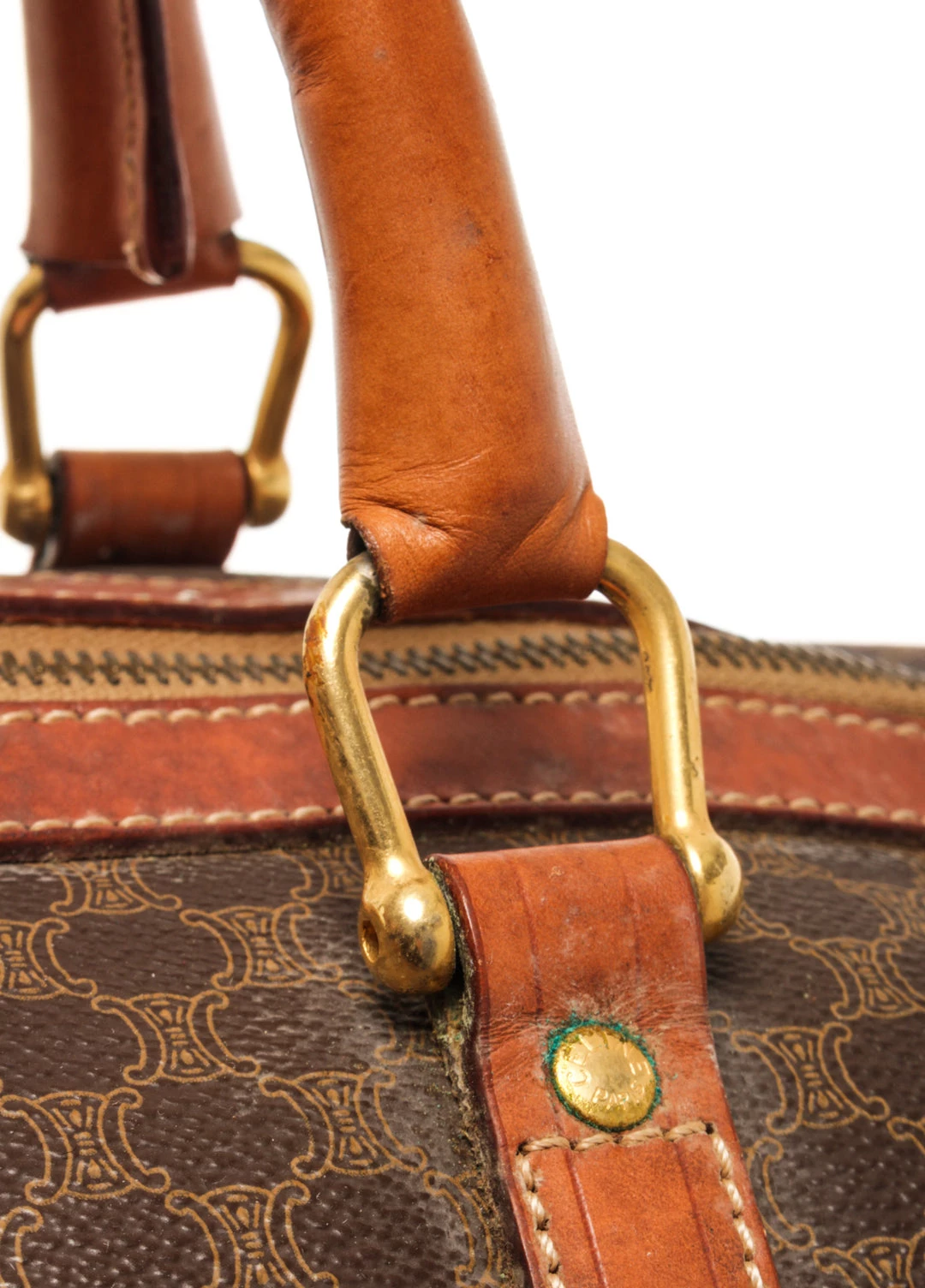 Celine Brown Macadam Boston Bag with top handle, gold tone hardware, zipper closure and canvas lining. There is wear on the bottom and white marks around the bag. Please refer to photos.