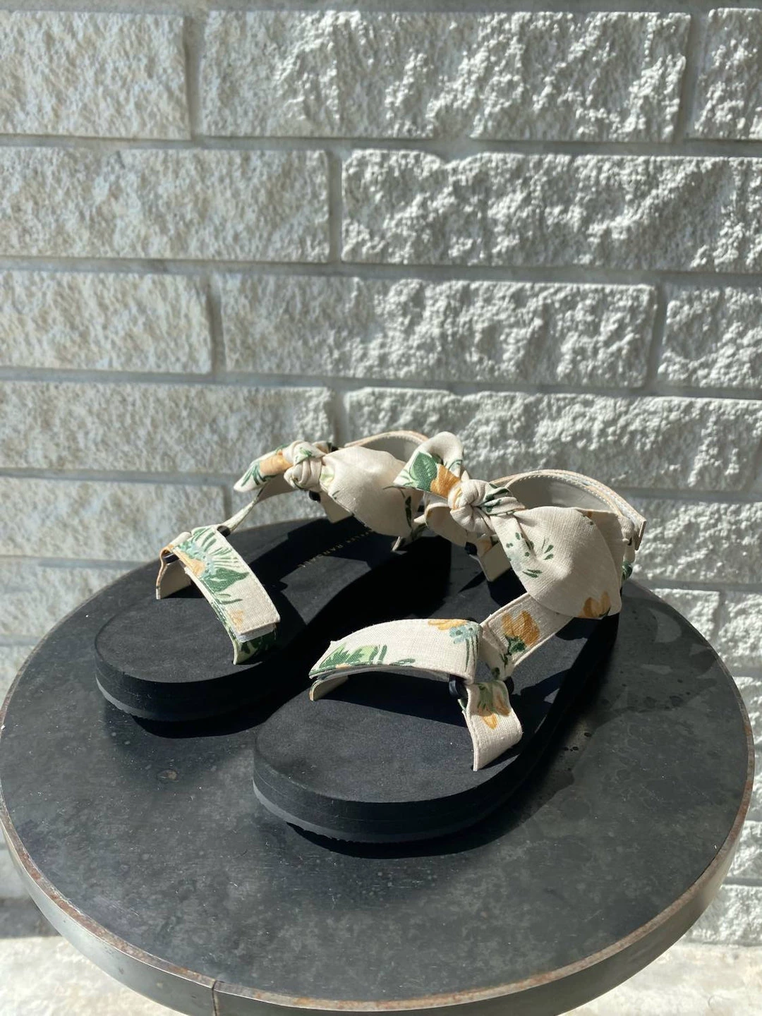 Sandal has a cushioned foam footbed and floral patterned canvas fabric. It is open toed with velcro strap closures and a large bow in the front ankle strap.๏ฟฝ๏ฟฝ.